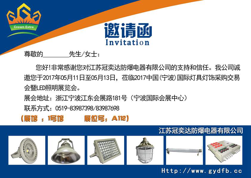 您好!非常感謝您長(zhǎng)期以來對(duì)江蘇冠奕達(dá)防爆電器有限公司的支持和信任!我公司定于2017年5月11日至2017年5月13日,于寧波國(guó)際會(huì)展中心參加2017中國(guó)(寧波)國(guó)際燈具燈飾采購(gòu)交易會(huì)暨LED照明展覽會(huì)。